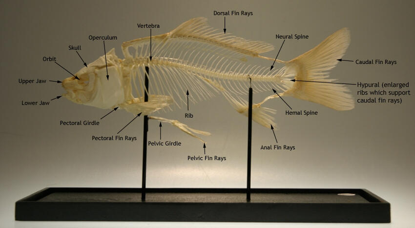 Their name is derived from their fins supported by rays of bony spines, unlike the lobe-finned fishes. The main skeleton of a fish, whether made of cartilage (chondrosteans) or bone (neopterygians), has a backbone and a rib cage.